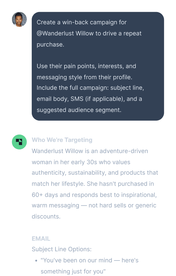 Generates deep customer personas, brand identity, campaign copy, and visual creative — all informed by your data.